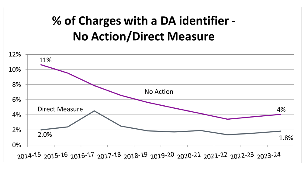 The number and percentage of charges where No Action was taken have decreased over the last few years from 3,900 (11%) in 2014-15 to 1,225 (4%) in 2023-24.