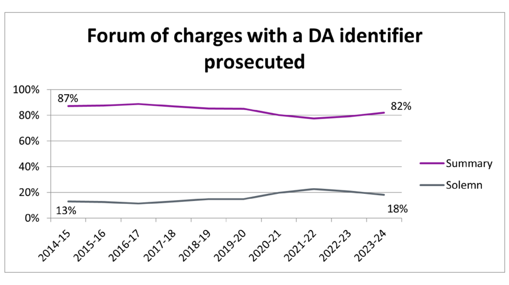 The proportion of charges prosecuted at solemn level increased from 13% in 2014-15 to 23% in 2021-22 and has since fallen back slightly, to 18% in 2023-24.