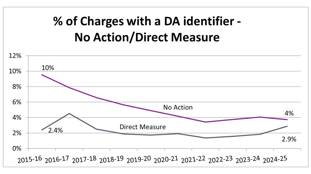 The number and percentage of charges where No Action was taken have decreased over the last few years from 3,280 (10%) in 2015-16 to 1,129 (4%) in 2024-25.