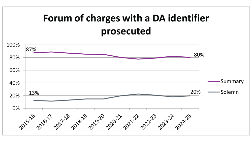 The proportion of charges prosecuted at solemn level was at 13% in 2015-16 and has generally increased over the last few years standing at 20% for 2024-25 (18% in 2023-24).